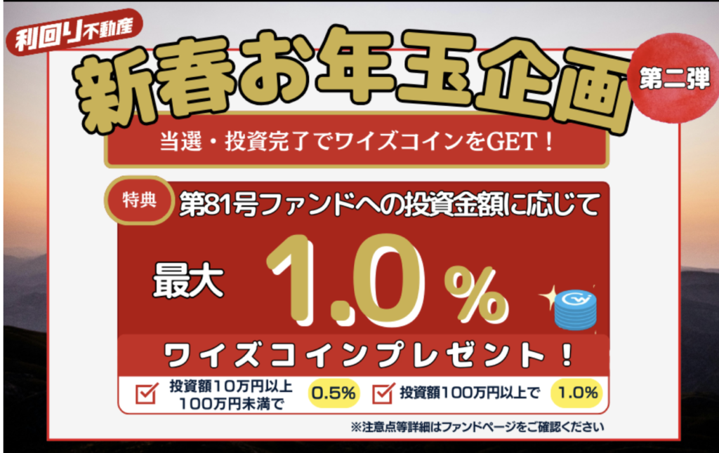 今回募集されてる「81号ファンド」に1万円以上投資するだけで、さらにアマギフ1,000円分がもらえるよ。