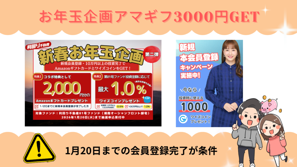 不動産クラウドファンディングの「利回り不動産」で、今キャンペーンが重なりすぎていて、「合計3,000円分以上」のお得をサクッと拾えるチャンスが来てる‼
